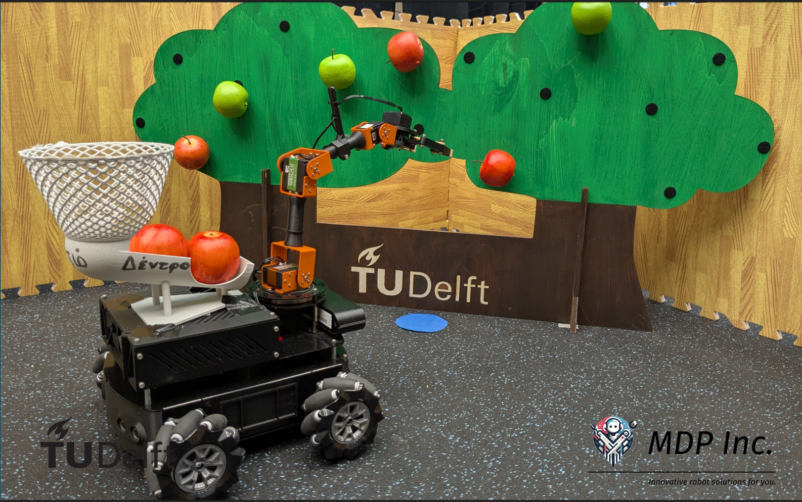 Designed and validated a cost-effective autonomous harvesting solution using the MIRTE Master platform to operate in unstructured agricultural environments. The system utilizes ROS 2 for modular control, integrating SLAM Toolbox and MPPI for robust navigation and dynamic obstacle avoidance. Perception relies on a fine-tuned YOLOv8n model that achieved 0.99 mAP@50 for differentiating ripe/unripe apples, enabling precise end-effector targeting. To ensure safety, a visual gesture recognition pipeline was implemented to interpret human commands in real-time. Despite hardware constraints, a compliant friction-based grasping strategy was engineered to successfully harvest and deposit apples into a custom-designed storage unit